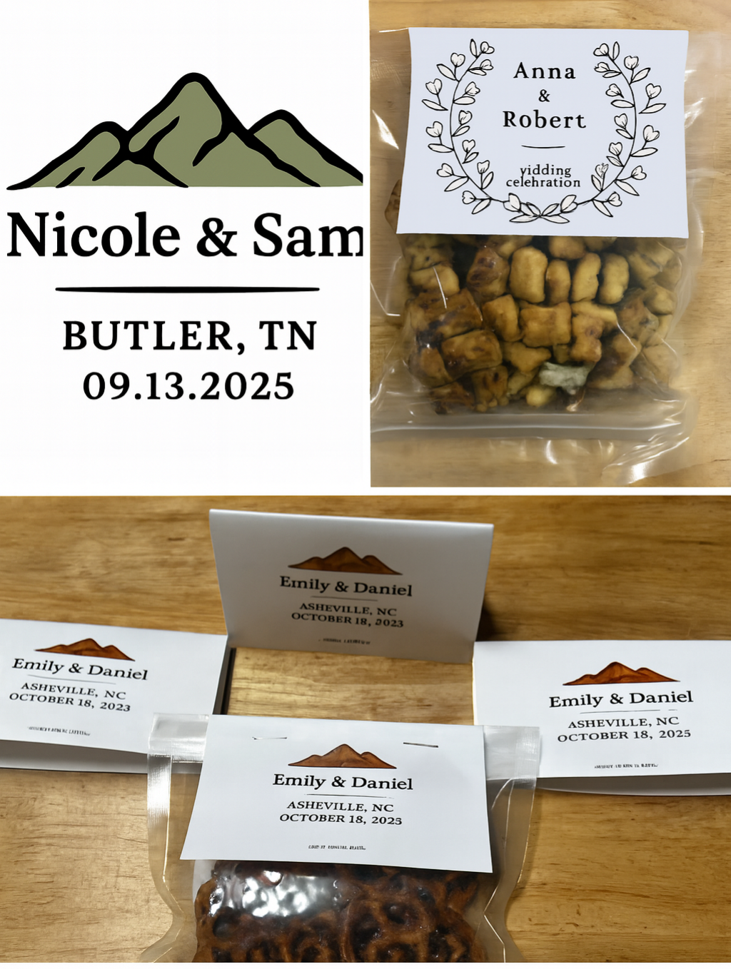 Welcome bags, favors, rehearsal dinner snacks, late-night bites.